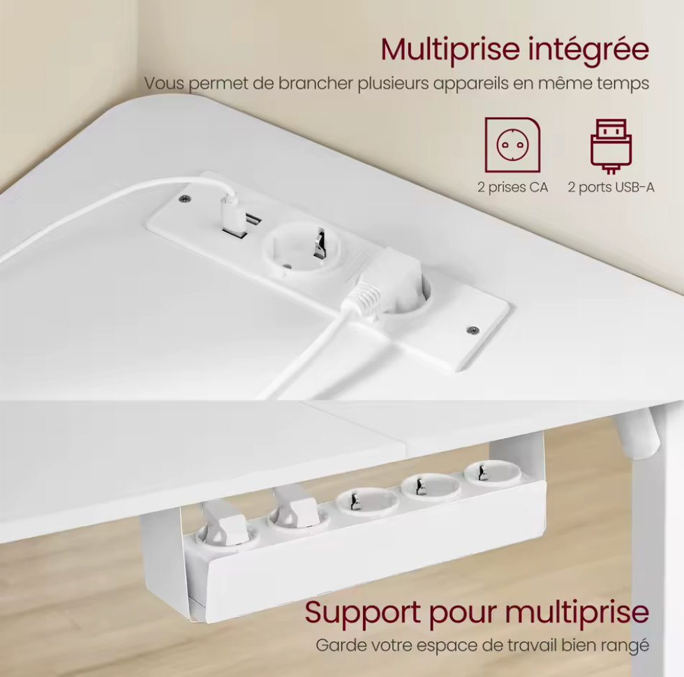 Optimisez votre espace avec le DeskMotion Corner, le bureau d’angle réglable idéal pour les setups professionnels. Son design en L et ses ports intégrés (USB + prises) offrent un confort inégalé pour télétravail ou gaming.
