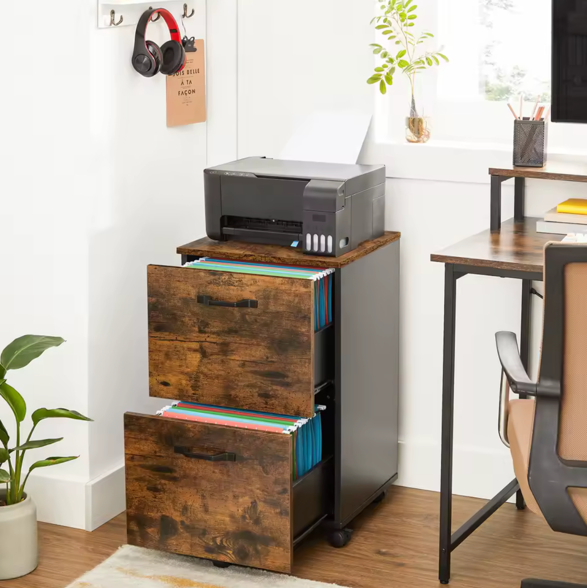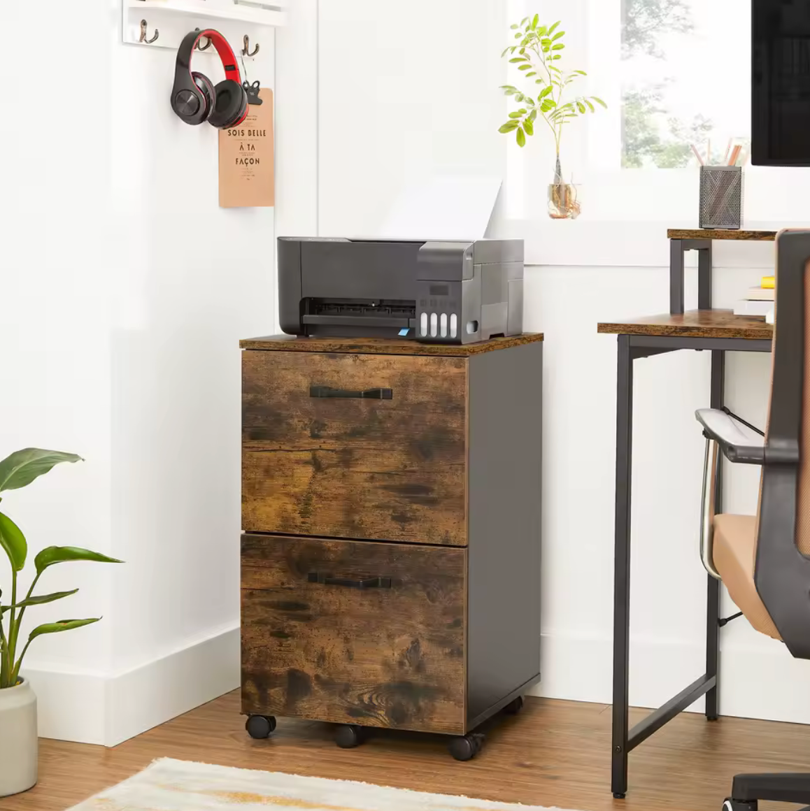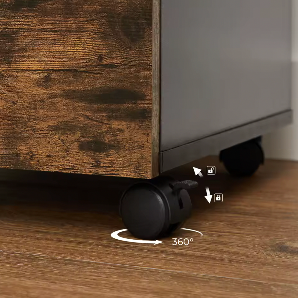 Organisez vos documents avec style grâce au FileBox, un caisson mobile au design bois rustique et structure robuste. Avec ses 2 tiroirs spacieux et ses roulettes pivotantes, il allie élégance et praticité pour le bureau ou le télétravail.