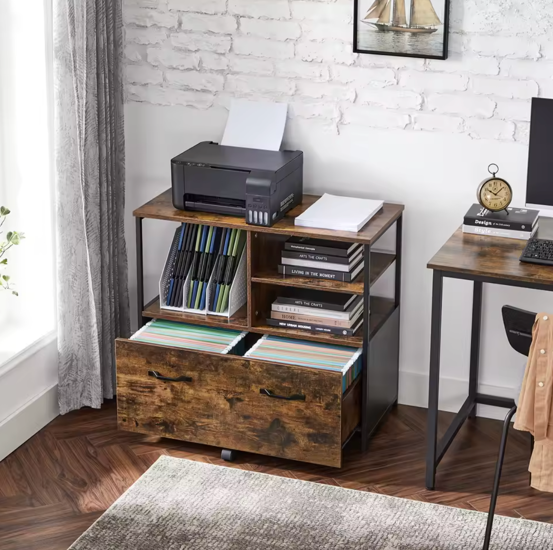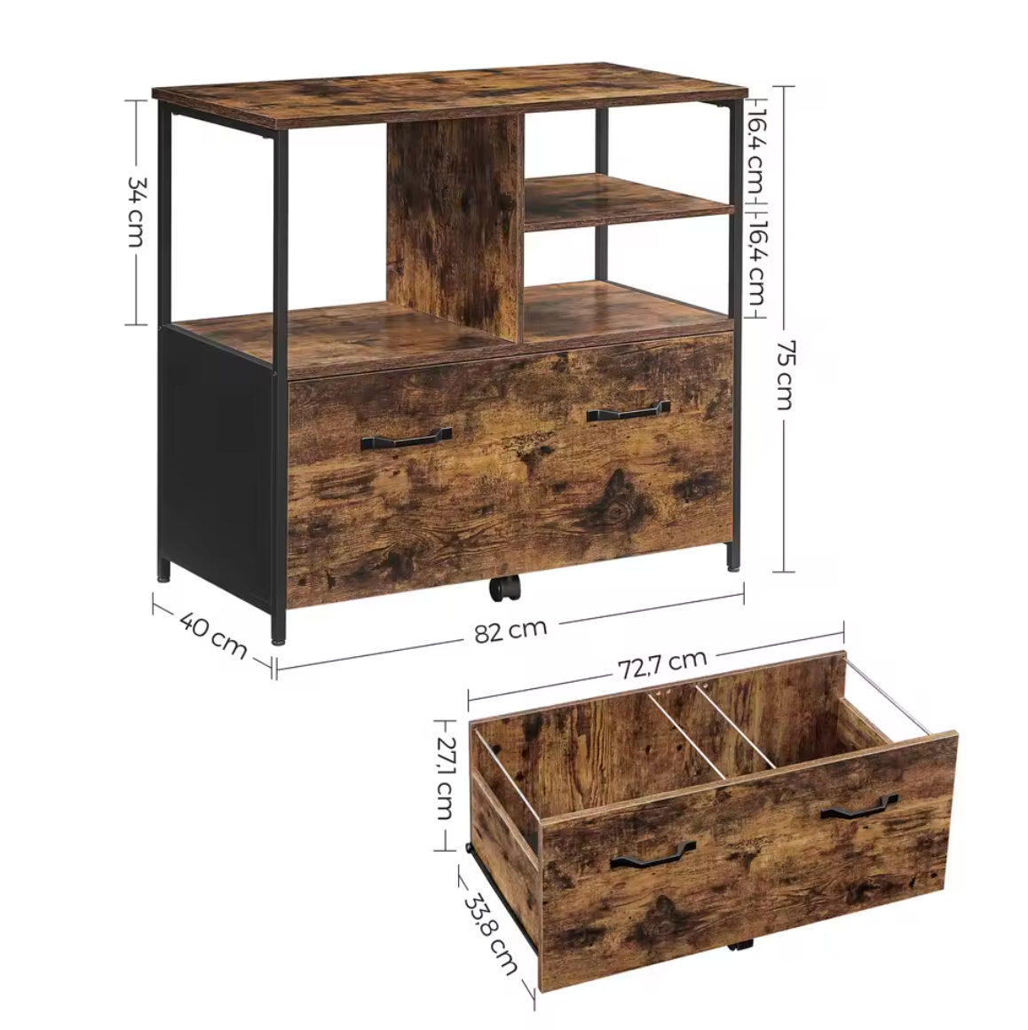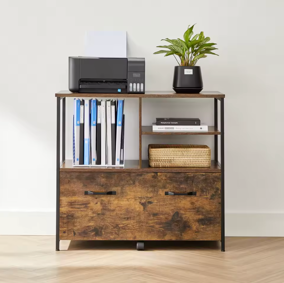 Optimisez votre espace avec le StoragePro, un meuble polyvalent au style industriel. Ses compartiments ouverts et son grand tiroir offrent un rangement pratique pour imprimante, fournitures ou dossiers.